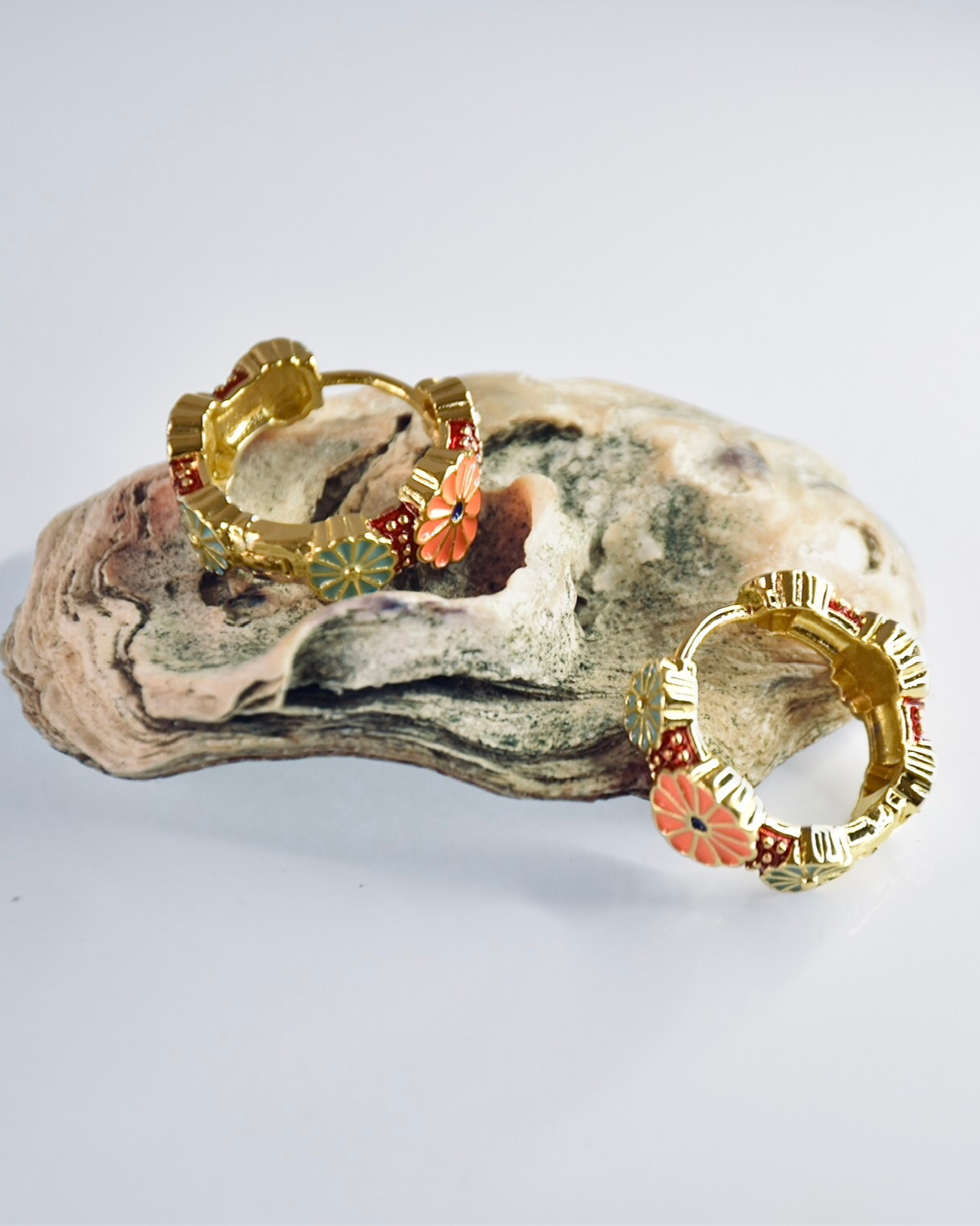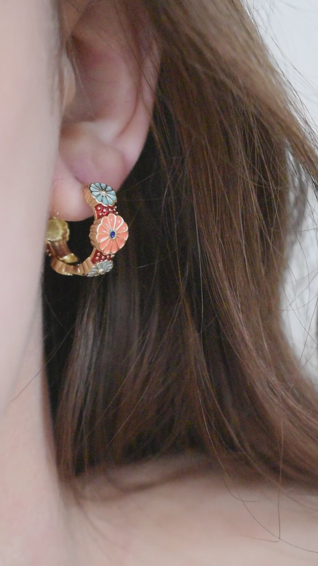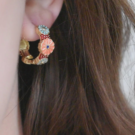 Ces créoles en laiton de haute qualité, ornées d'un motif floral émaillé en rouge, orange et bleu, allient finesse et éclat. Leur design coloré et raffiné apporte une touche de fraîcheur à un style intemporel.