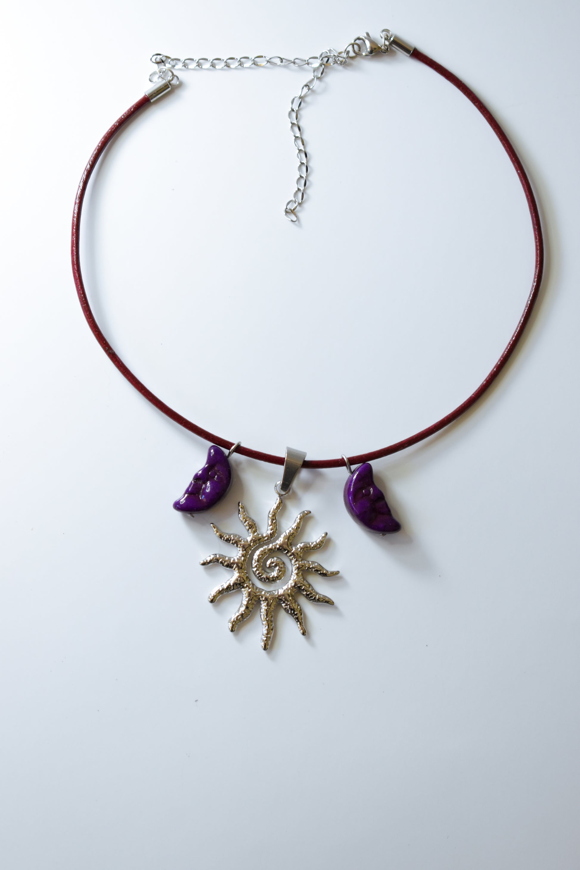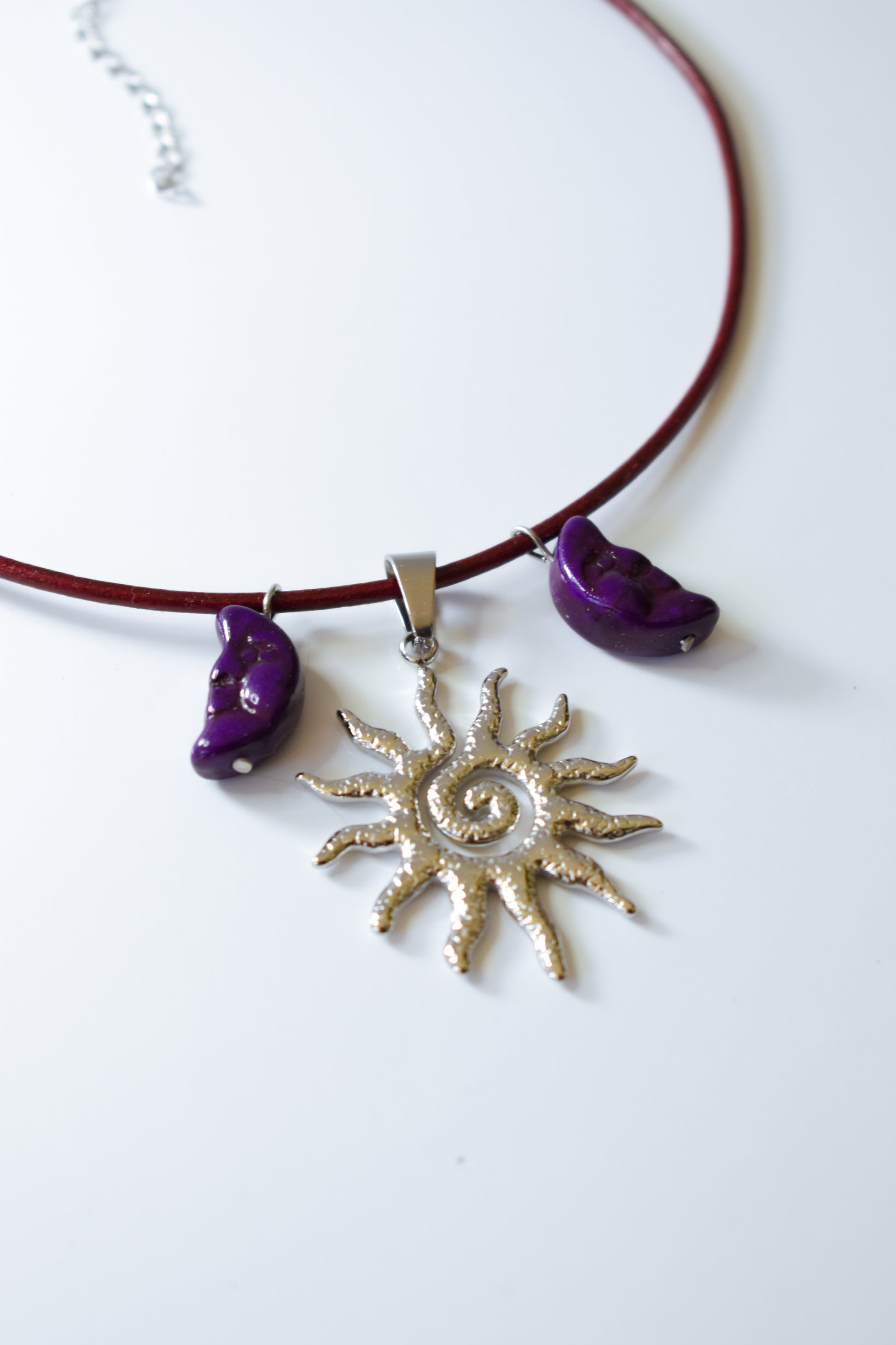 Collier en lacet de cuir bordeaux, orné de deux lunes violettes en perle et d’un soleil argenté central.