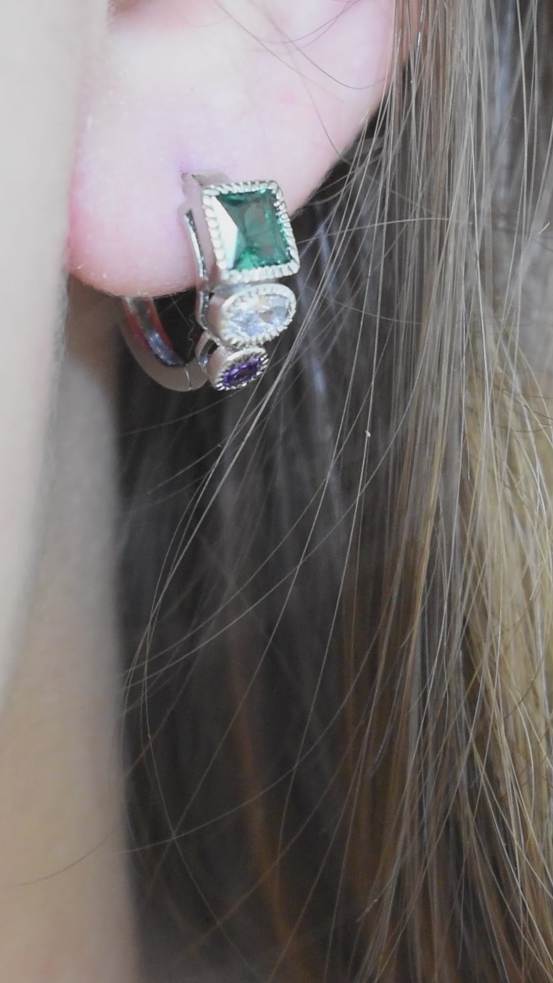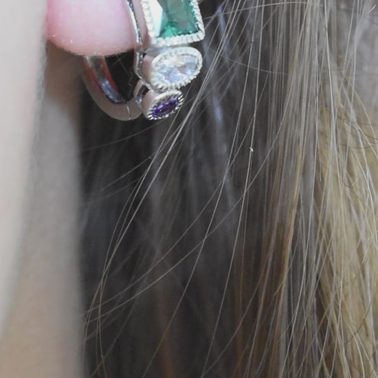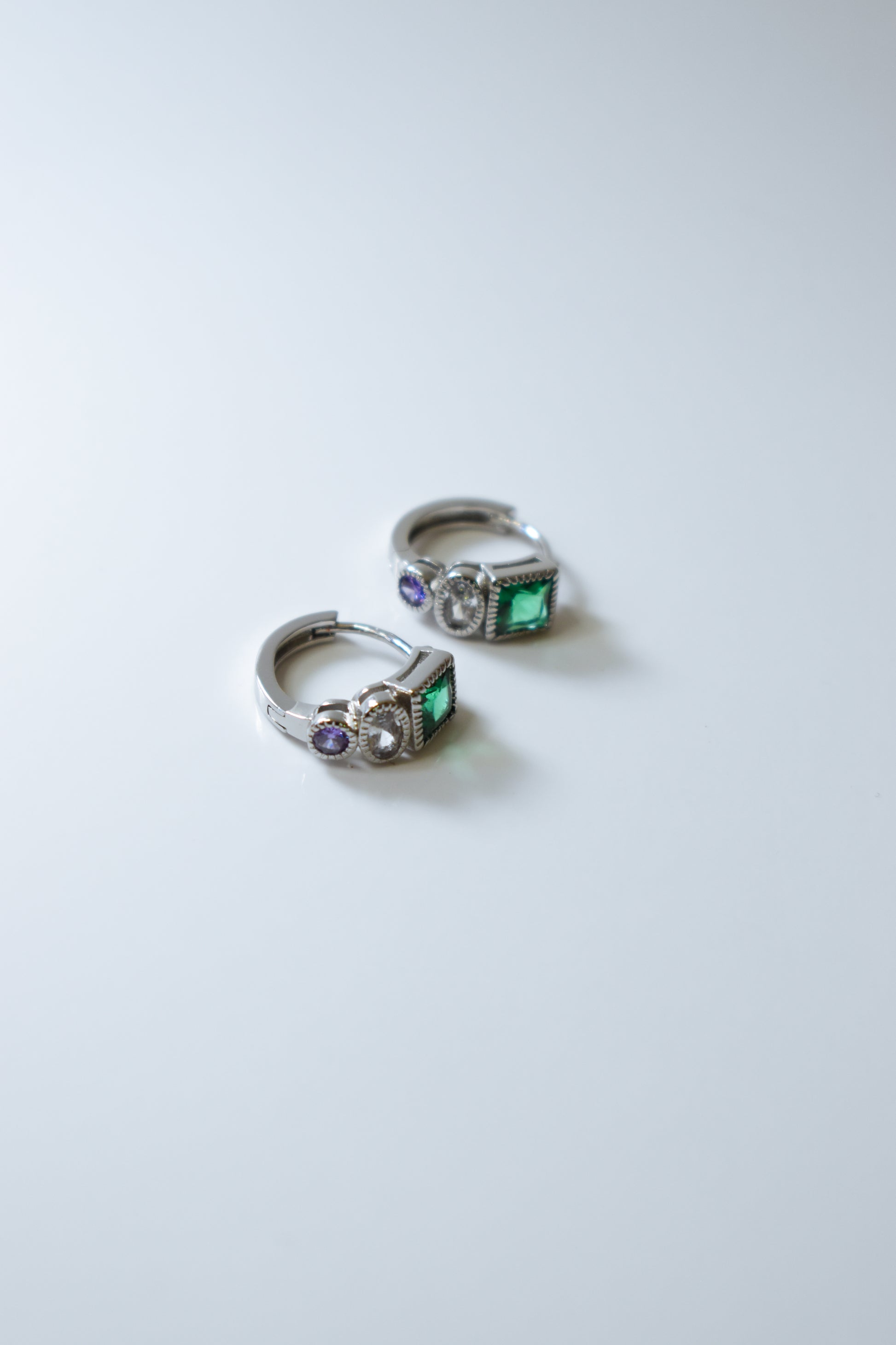 Créoles argentées en laiton, serties de pierres en zirconium et verre teinté.